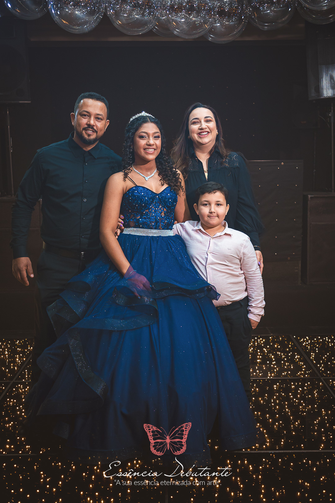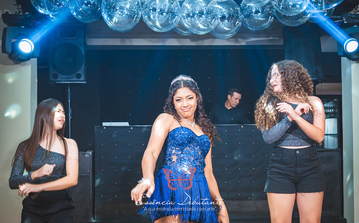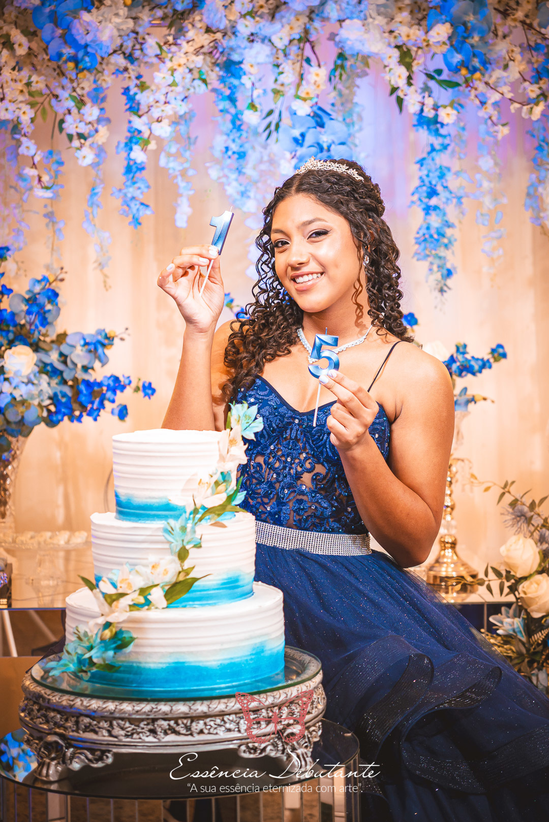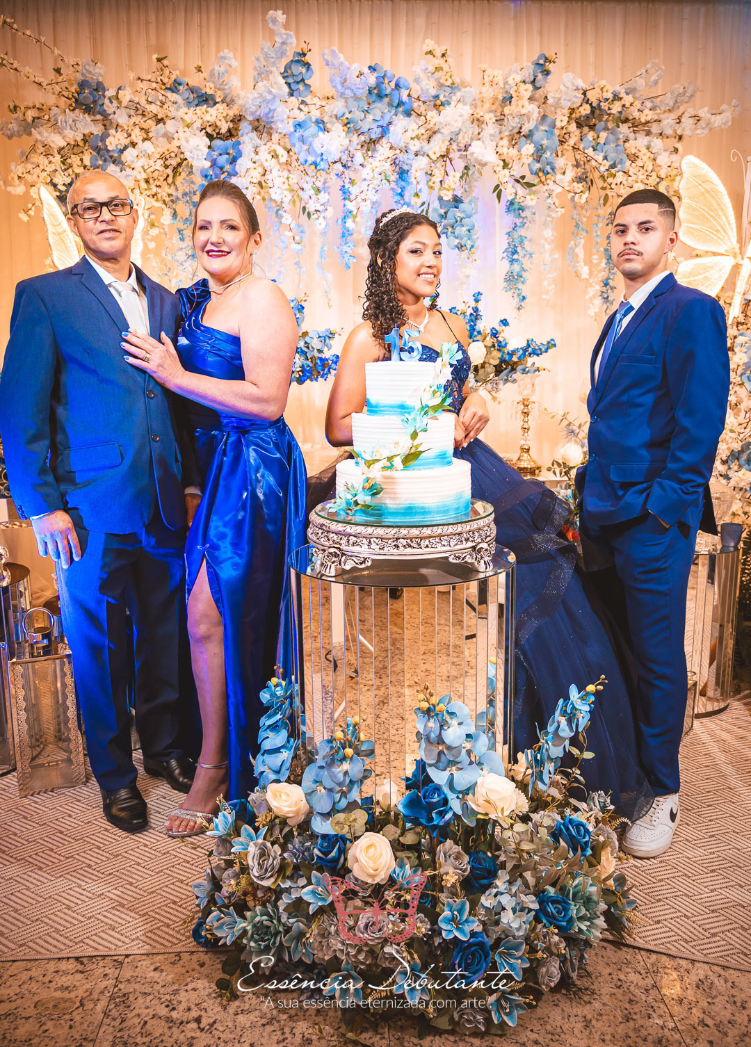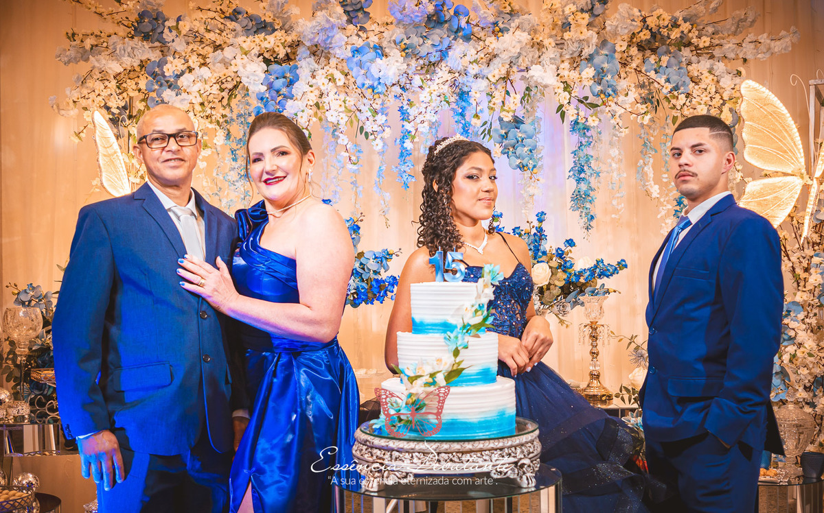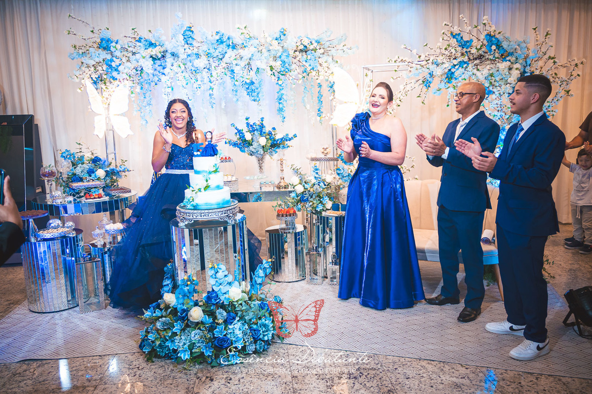 Vestida de azul royal e cercada de amor, Maria celebrou seus 15 anos em grande estilo.