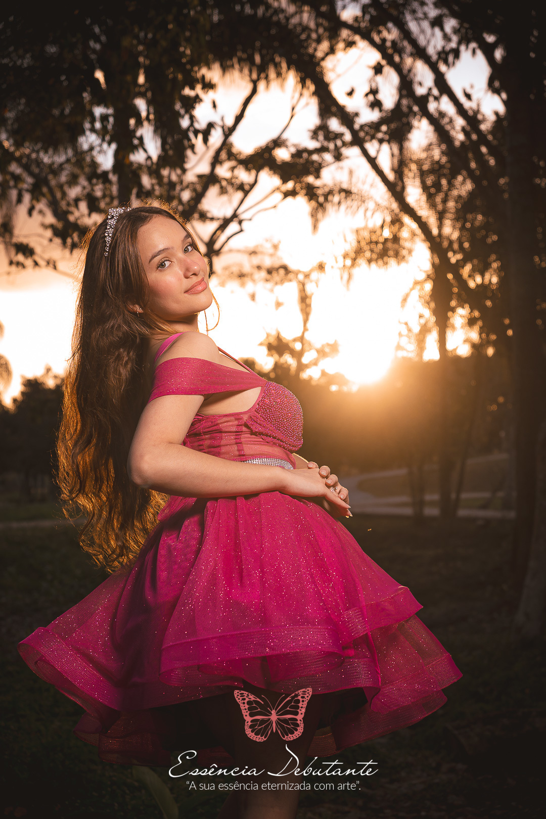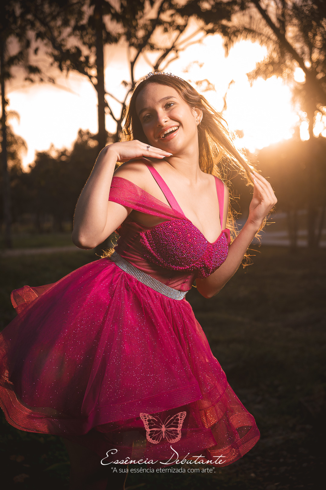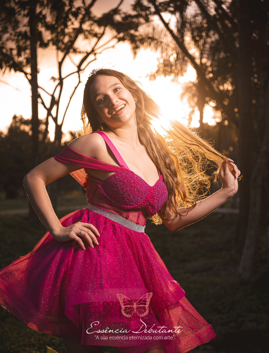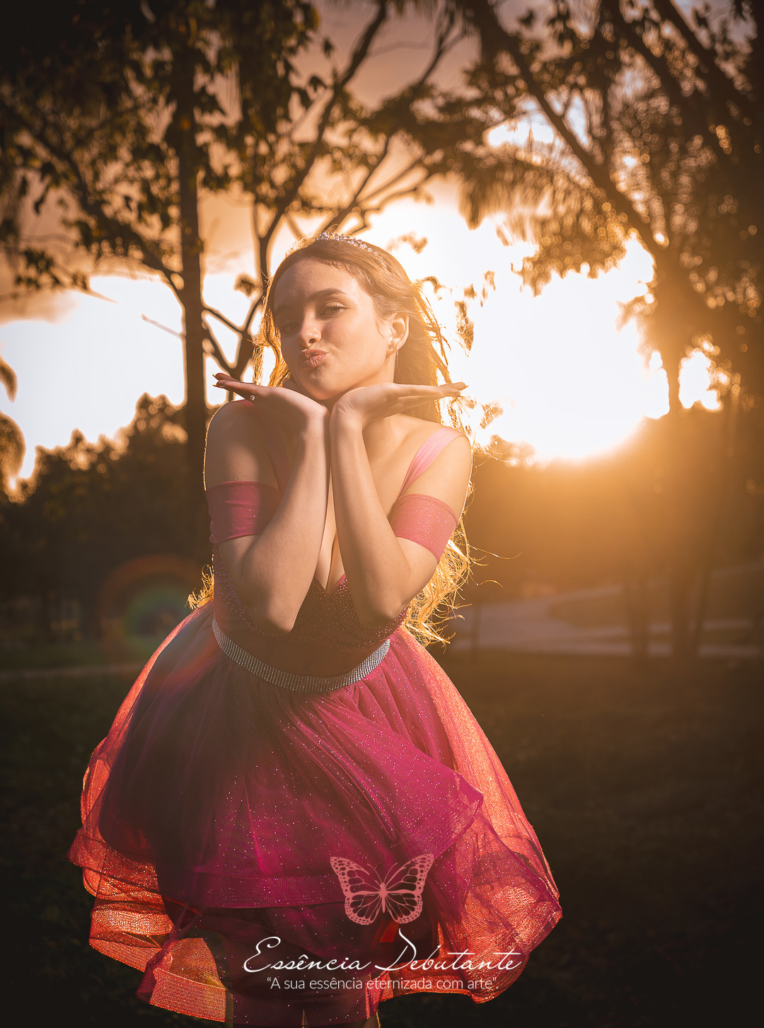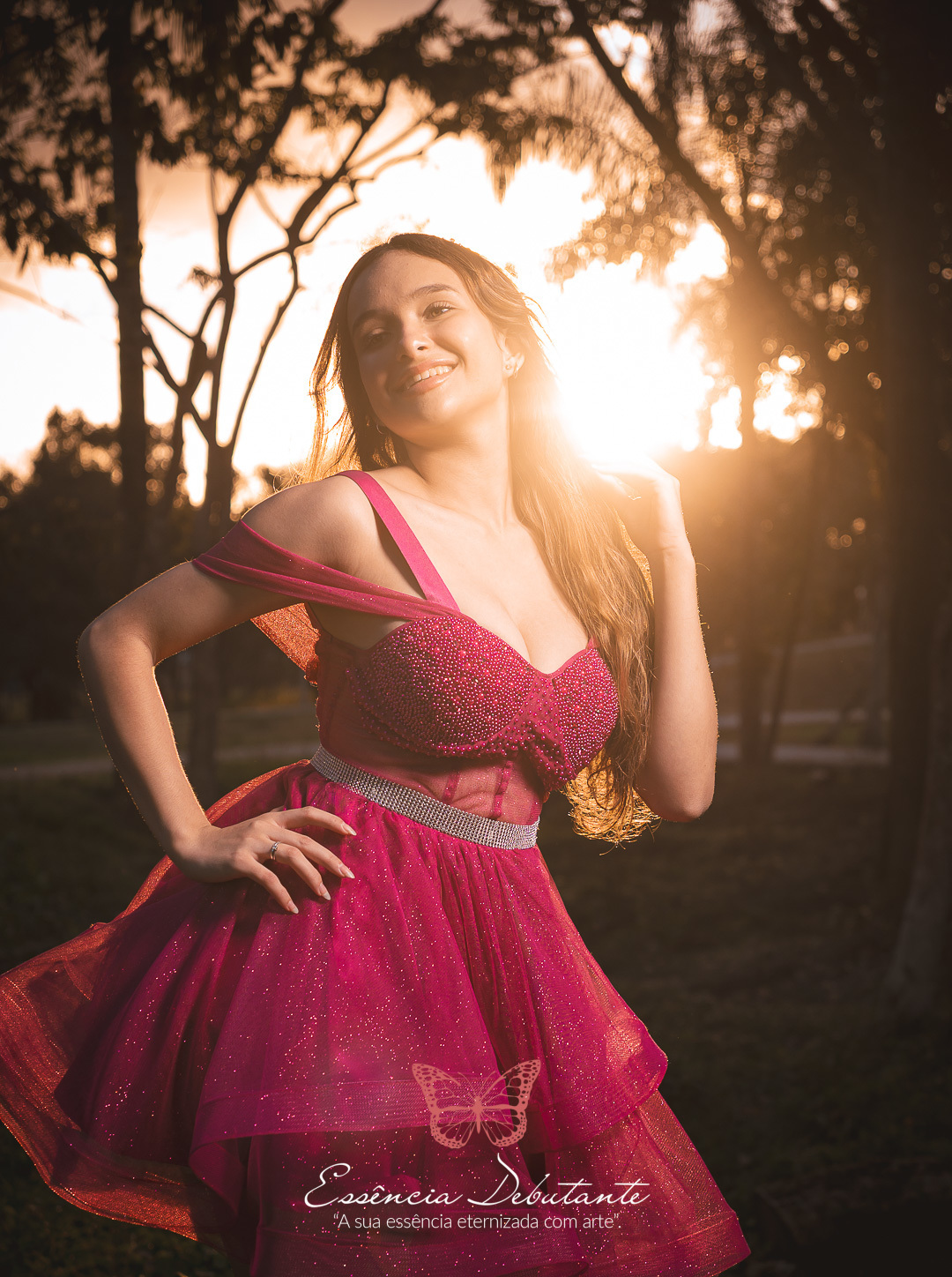Entre o brilho do vestido e o dourado do entardecer, cada clique revela mais do que uma imagem — revela um sentimento.